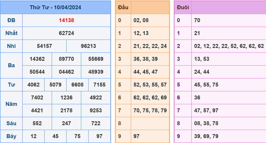 | Ngày | Bạch Thủ Lô | Song Thủ Lô | Lô Xiên | Lô Rơi – Lô Lặp | Lô Đảo |